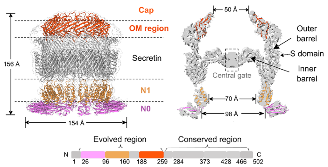 研究团队通过高分辨率冷冻电镜技术,解析了AcGspD蛋白在近原子级别(2.4 Å)的三维结构,揭示其为一个由14个亚基组成的稳定β-桶状结构。该结构具备三大创新特性: